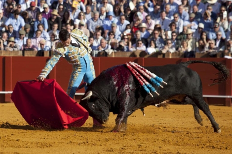 En el sexto se vio el nivel habitual de Manzanares en Sevilla. Gran toro de Juan Pedro Domecq y gran faena de Manzanares que hace sonar 'Cielo andaluz'. El úblico explota con la faena del alicantino, que triunfa 'in extremis'. Estocada a recibir, un descabello y cae el toro. Dos orejas.