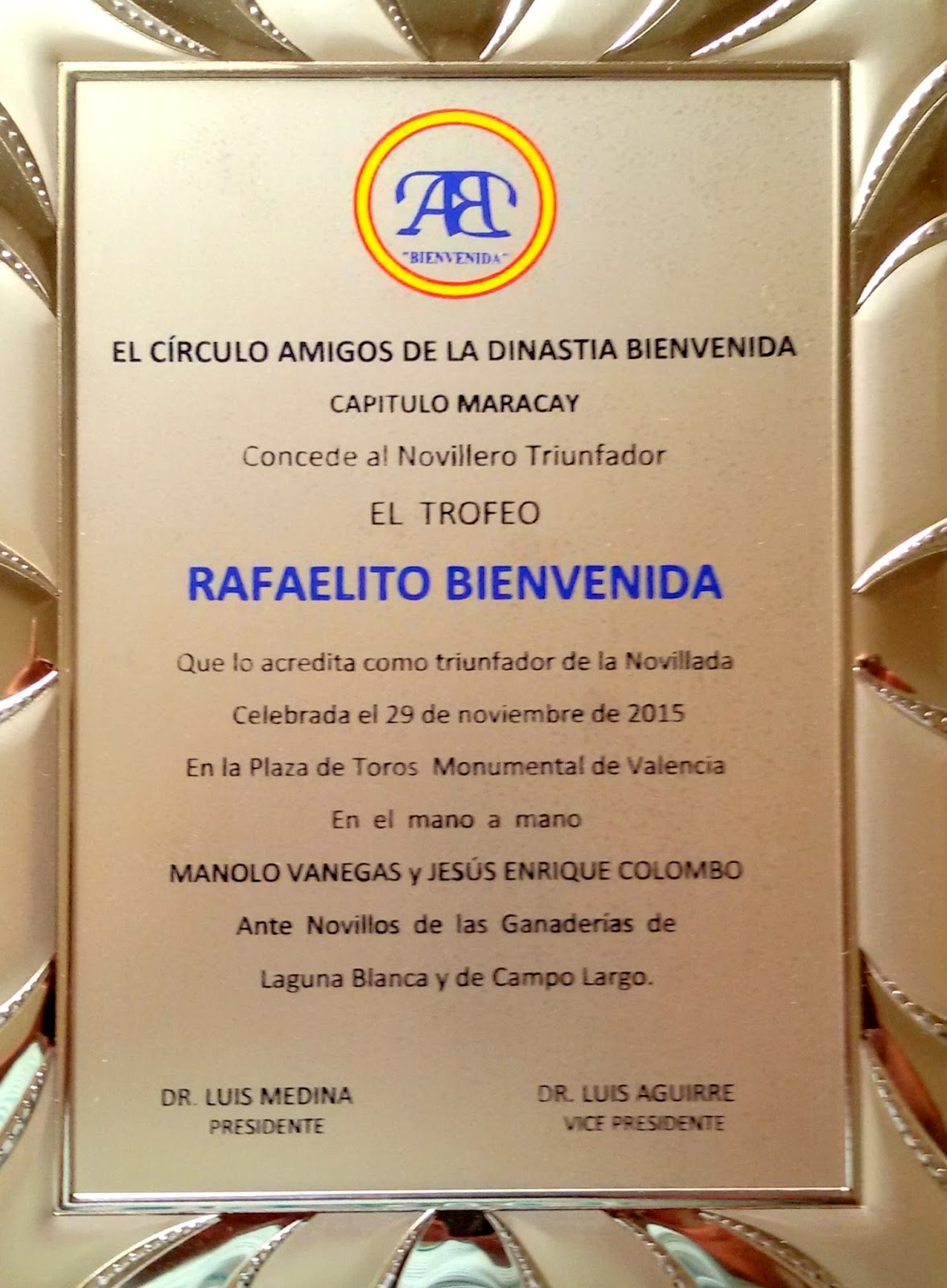 reconocimiento a este esfuerzo, el Círculo Taurino de la Dinastía Bienvenida